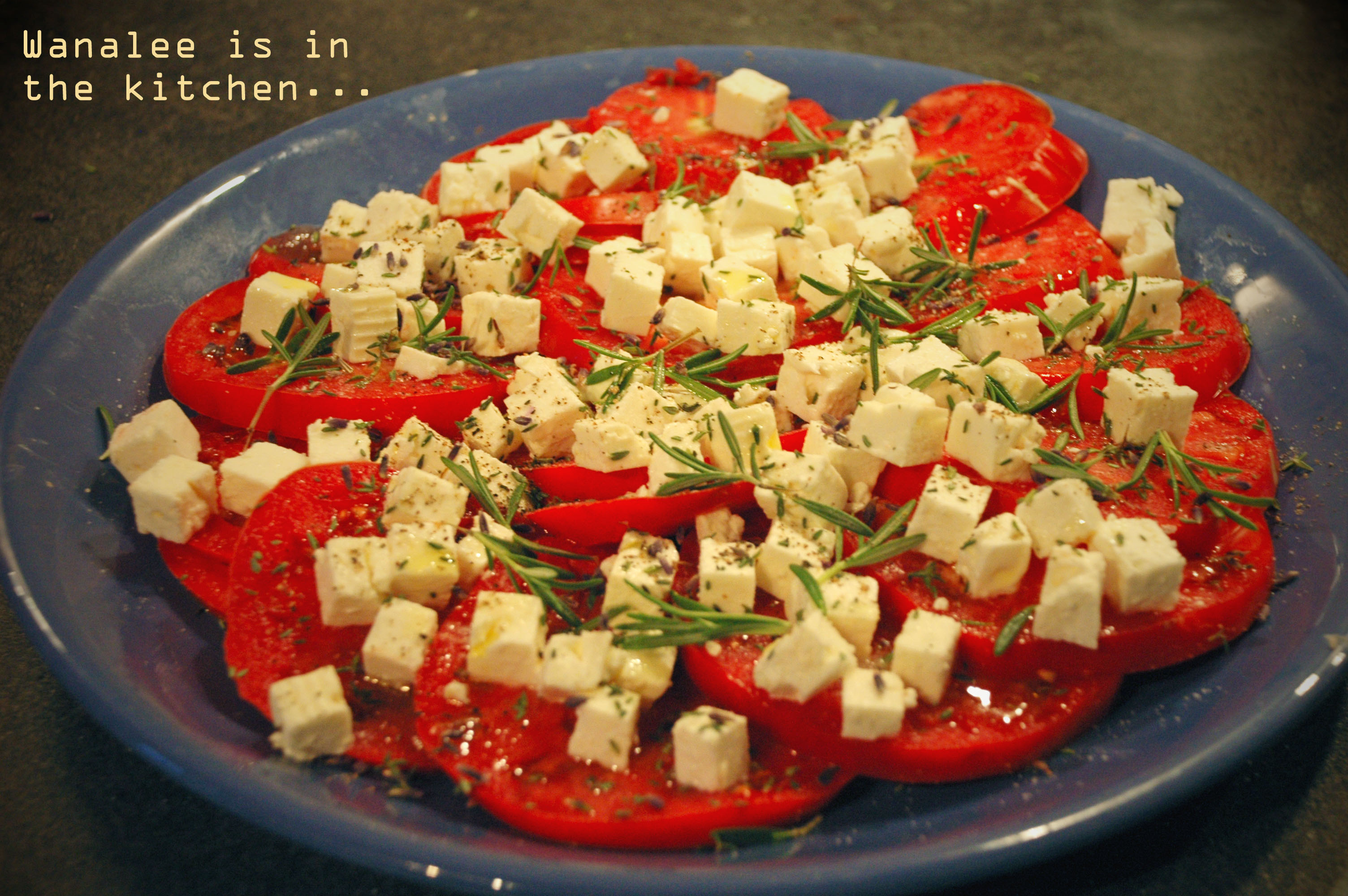 Couper les tomates en tranches et la feta en petits dés. Préparer la vinaigrette en émulsifiant 3 c. à s. d’huile d’olive avec 2 c. à s. de jus de citron, un peu de zeste de citron et une pincée de sucre. Saler et poivrer. Au moment de servir (pas avant, sinon les tomates dégorgent !), arroser la salade de vinaigrette et ajouter la lavande et le romarin. C’est déjà prêt !
