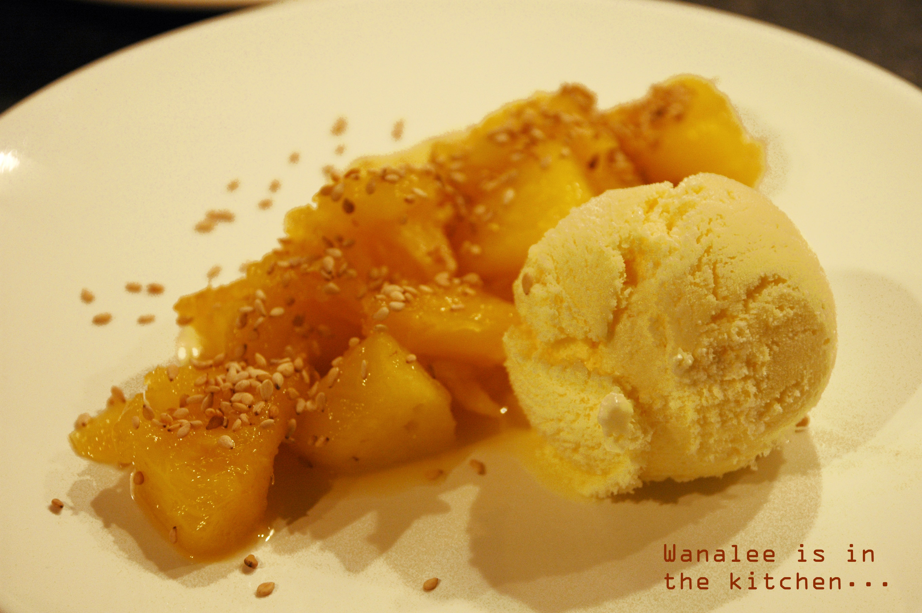 Dresser les assiettes en ajoutant une boule de glace vanille et saupoudrer de sésame.