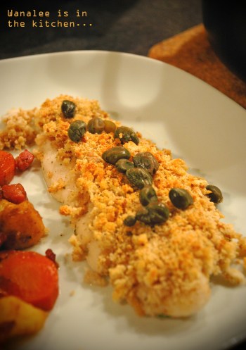Mixer les noix avec le parmesan et le pain sec. Répartir ce « crumble » sur le poisson et enfourner pendant environ 10 minutes (selon l’épaisseur du poisson). Servir avec quelques câpres.