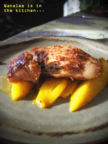 Peler et couper la mangue en grosses lanières. Les faire dorer dans une poêle avec une noisette de beurre. Maintenir au chaud.