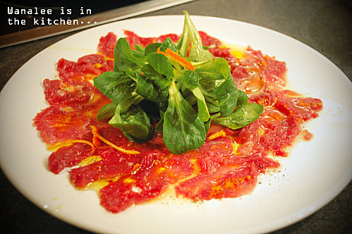 Sortir la viande et, avec un couteau bien éguisé, découper des tranches aussi fines que possible. Les disposer dans les assiettes sans les superposer. Parsemer de fleur de sel.