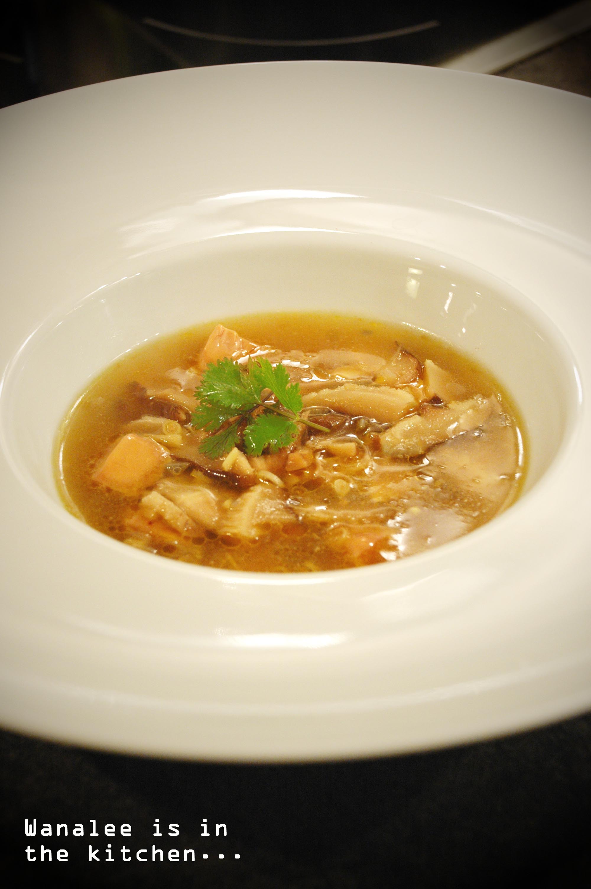 Couper le foie gras en petits cubes. Les déposer au fond d’une assiette creuse (ou d’une tasse). Verser le bouillon chaud dessus directement à table à l’aide d’un pichet et déposer à la surface quelques pluches de coriandre.