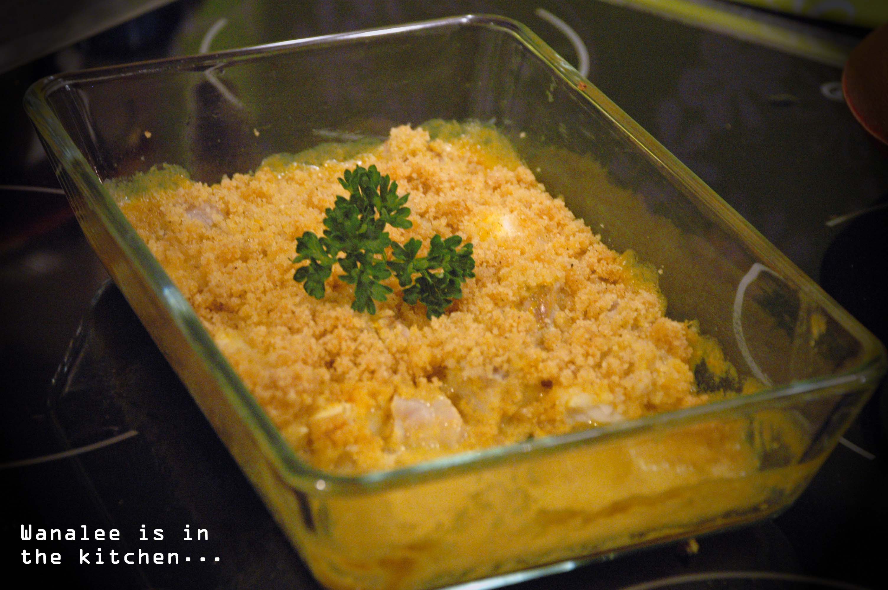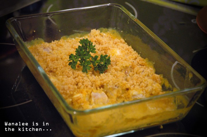 Disposer les dés de cabillaud dans un plat allant au four et mélanger avec la sauce au curry. Répartir par dessus le crumble.