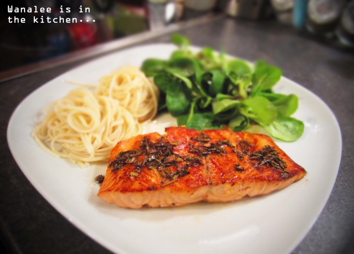 Servir le saumon arrosé de cette vinaigrette, accompagné de la salade avec sa sauce et des nouilles.