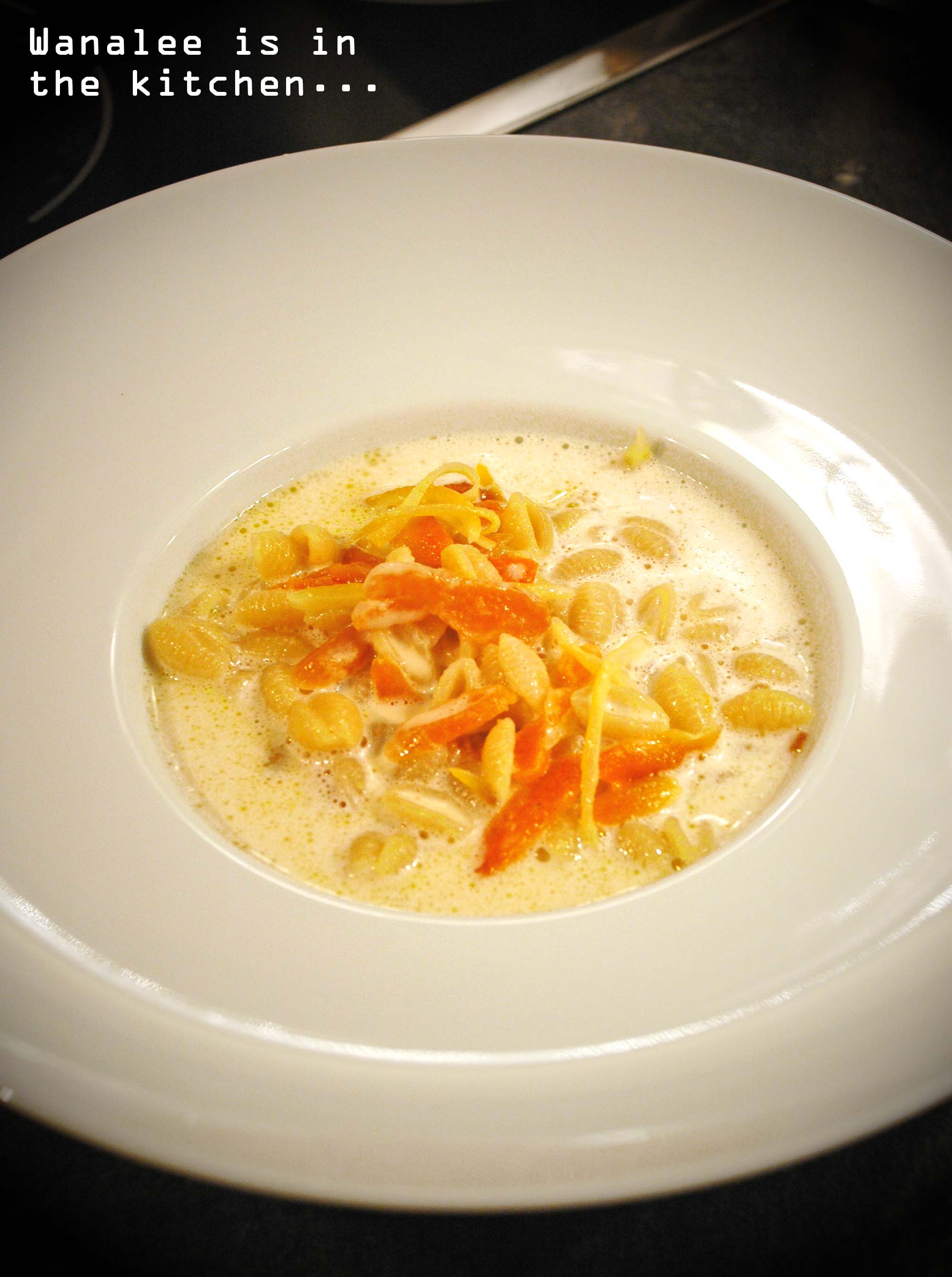 Dans chaque assiette creuse, verser sur les pâtes le bouillon de parmesan émulsionné à l’aide d’un mixeur. Servir rapidement !