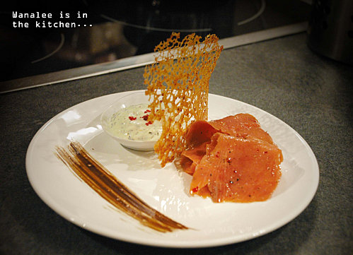 Saumon fumé mariné à la vodka, crème fraîche au gingembre et tuile au piment d’Esplette