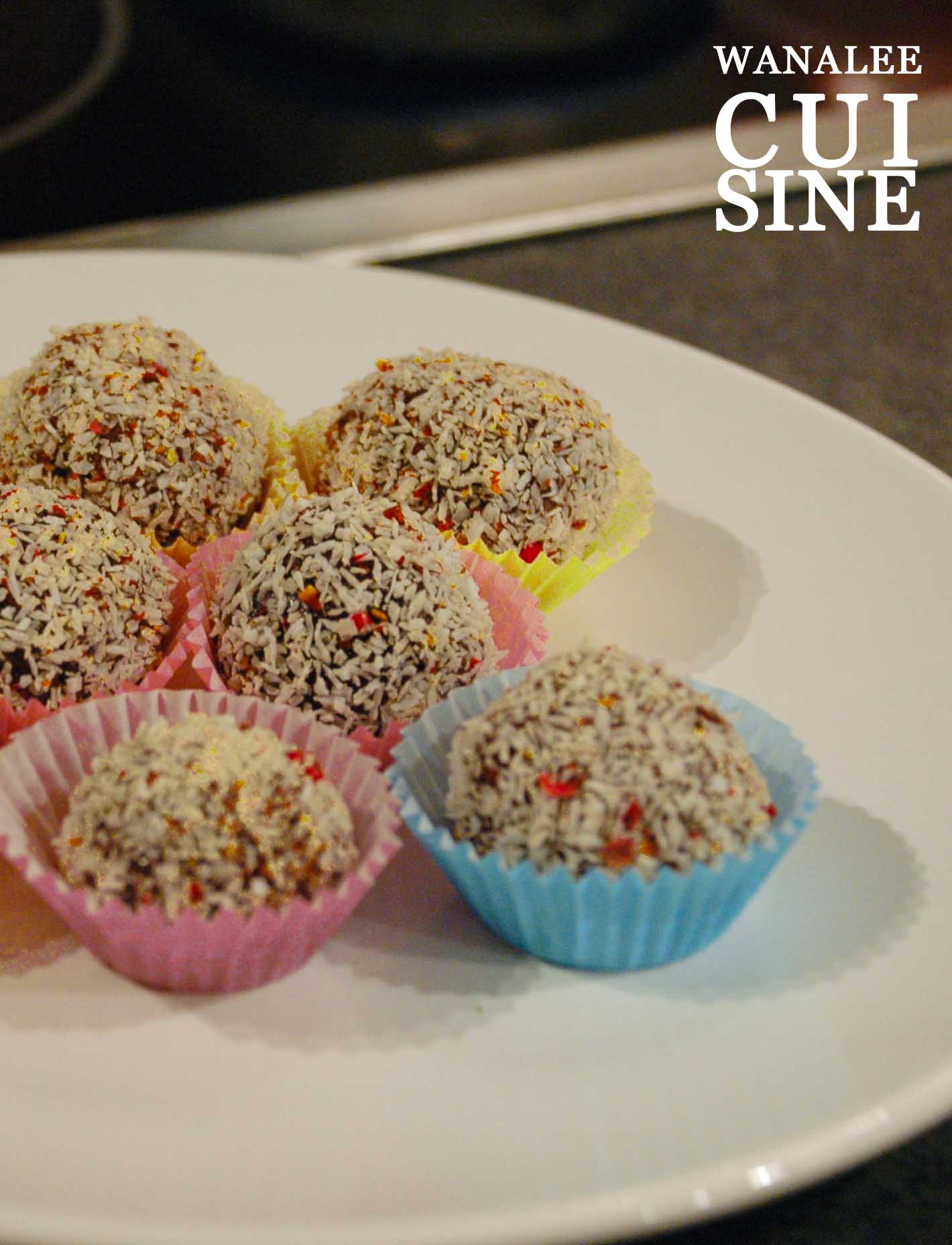 Mélanger la noix de coco avec le poivre rose et le piment d’Espelette. Façonner des “boulettes” de chocolat et les rouler dans le mélange coco-piment.