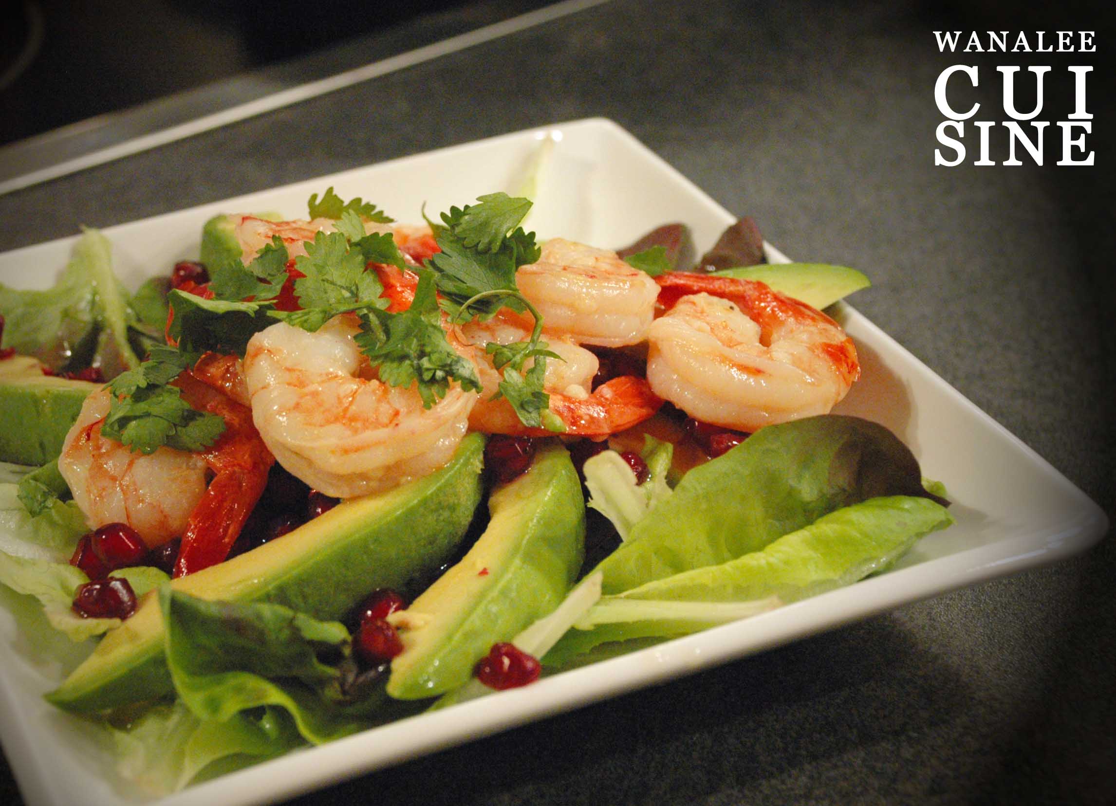 Dans des assiettes creuses, répartir la salade lavée et essorée. Déposer l’avocat par dessus, puis les grains de grenade. Ajouter les crevettes puis arroser de vinaigrette. Terminer par quelques feuilles de coriandre.