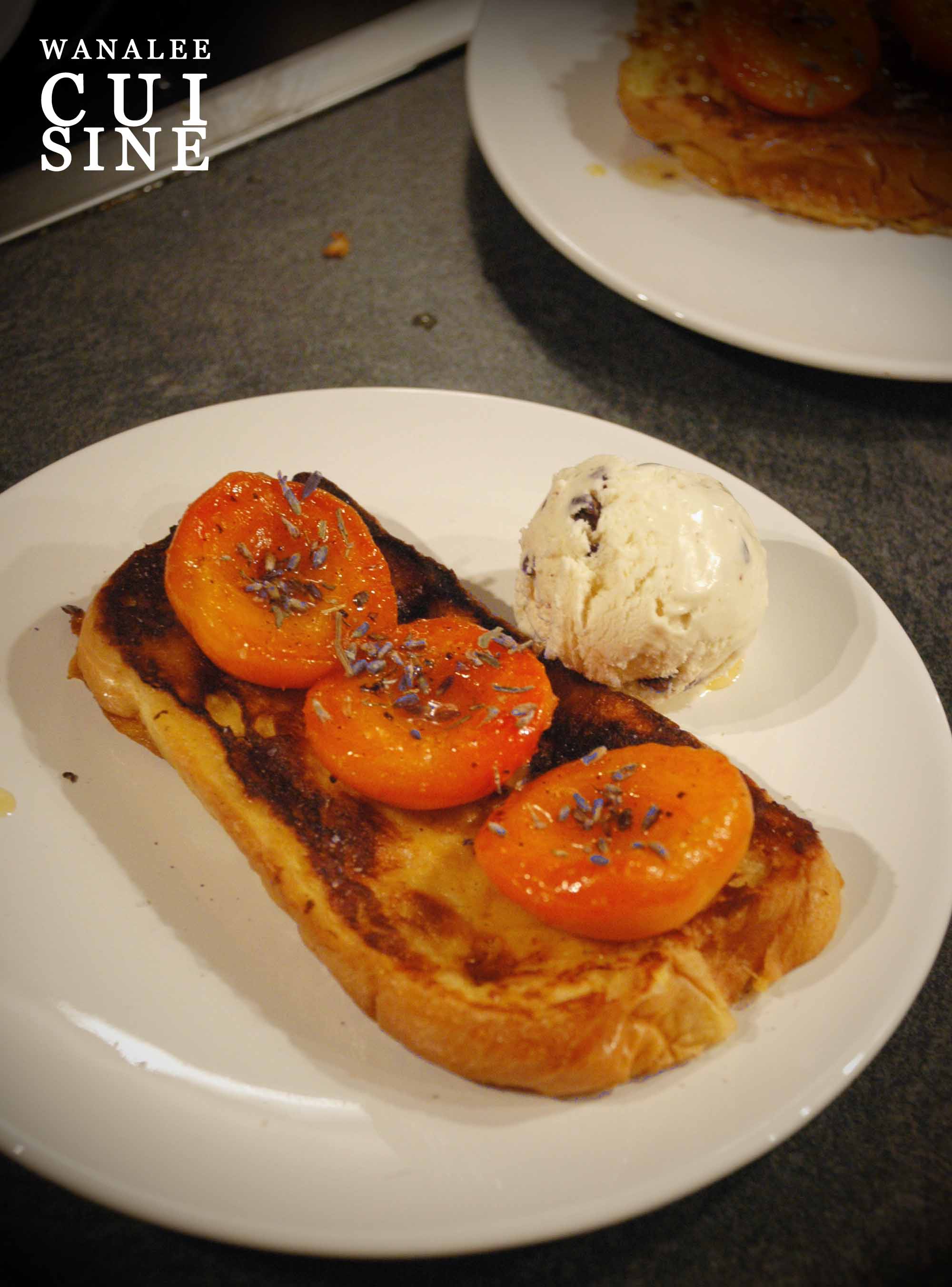 Servir les demi abricots poêlés déposés sur les tranches de brioche puis parsemer de quelques fleurs de lavande restantes. Ajouter éventuellement une boule de glace vanille.