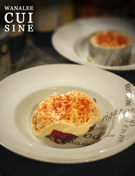 Dans un plat avec un cercle ou les verrines, mettre un morceau de pain imbibé, puis des tomates et ensuite du mélange au mascarpone. Recommencer jusqu’en haut de votre plat/verrine.