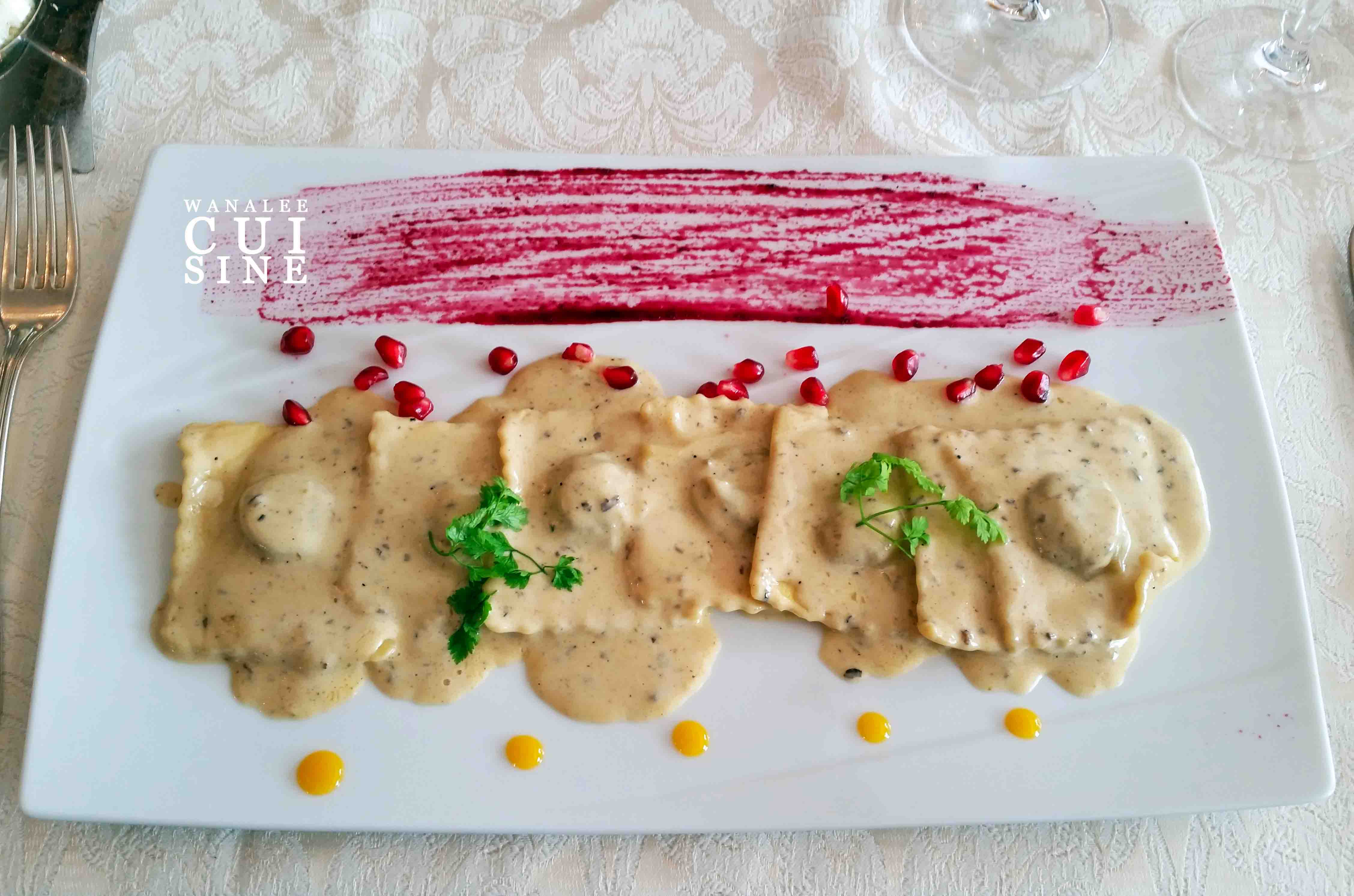 Raviole de bœuf braisé au vin rouge, crème à la truffe