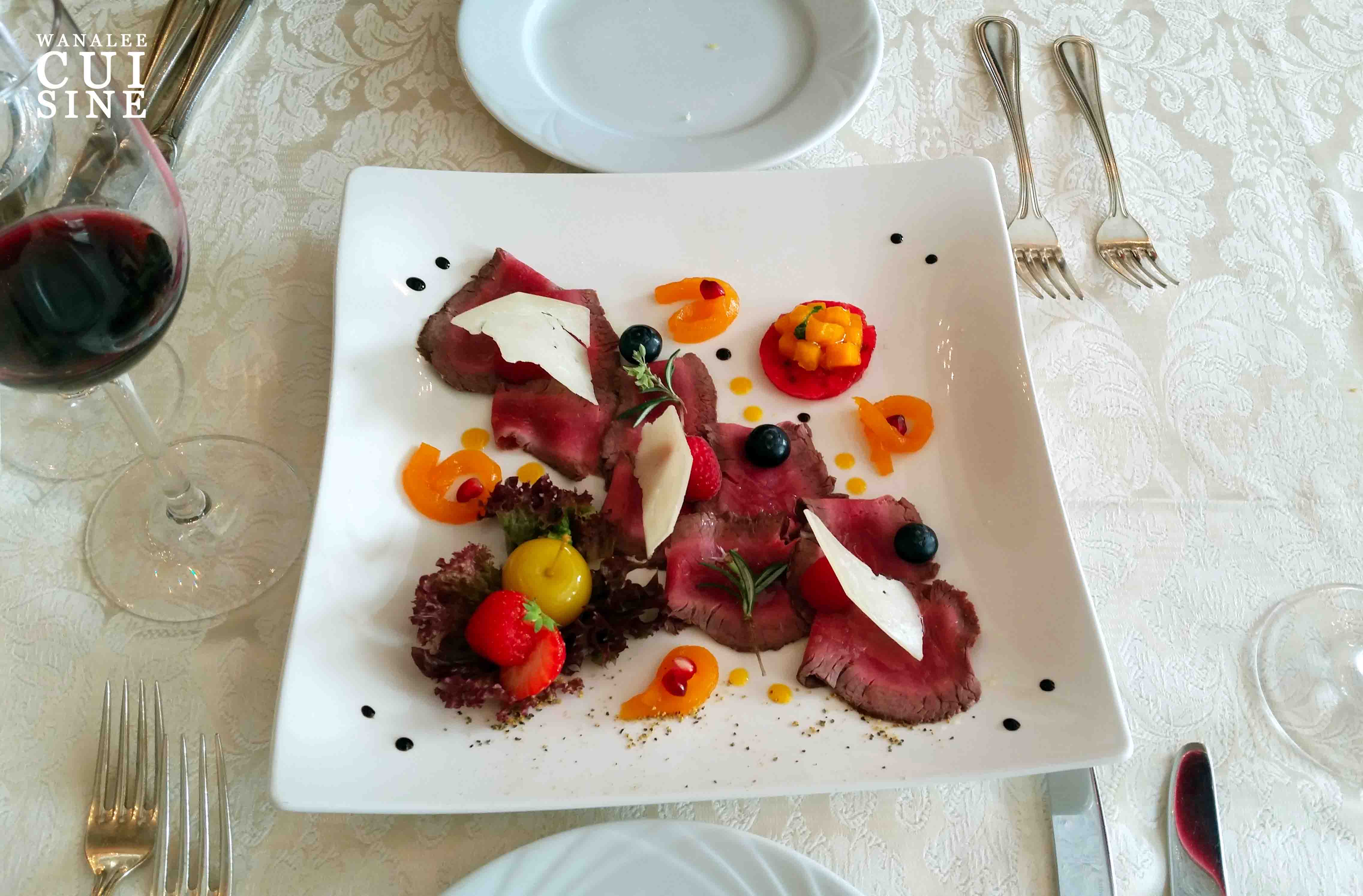 Carpaccio mi-cuit de cerf à l’huile de noix et copeaux de fromage de brebis