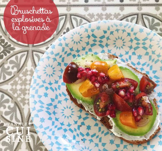 Ça y est, c’est l’automne. Il est temps de faire le premier feu de cheminée, de se cacher sous la couverture avec un bon thé fumant dans la main, un cookies dans l’autre, bref de cocooner! On oublie pourtant que c’est la saison des dernières tomates, les meilleures, celles qui sont vraiment gorgées de soleil et de sucre! Alors vite fait-bien fait, voici une recette hyper simple et rapide de bruschettas tomates, avocat, fromage frais et grenade.