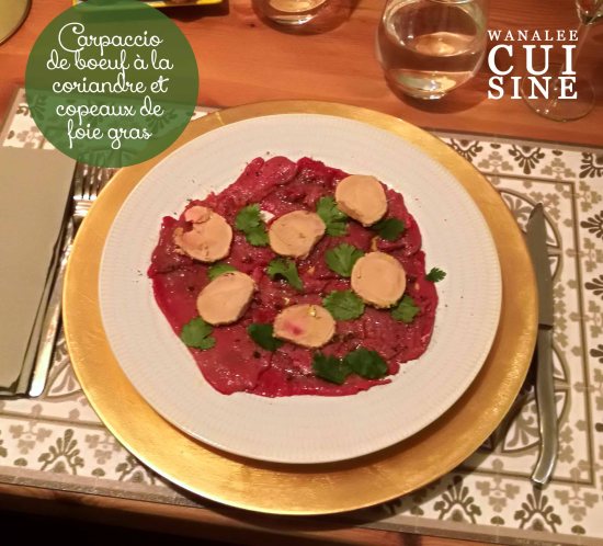 Au moment de servir, couper le foie gras en copeaux ou en tranches fines et répartir sur le carpaccio.