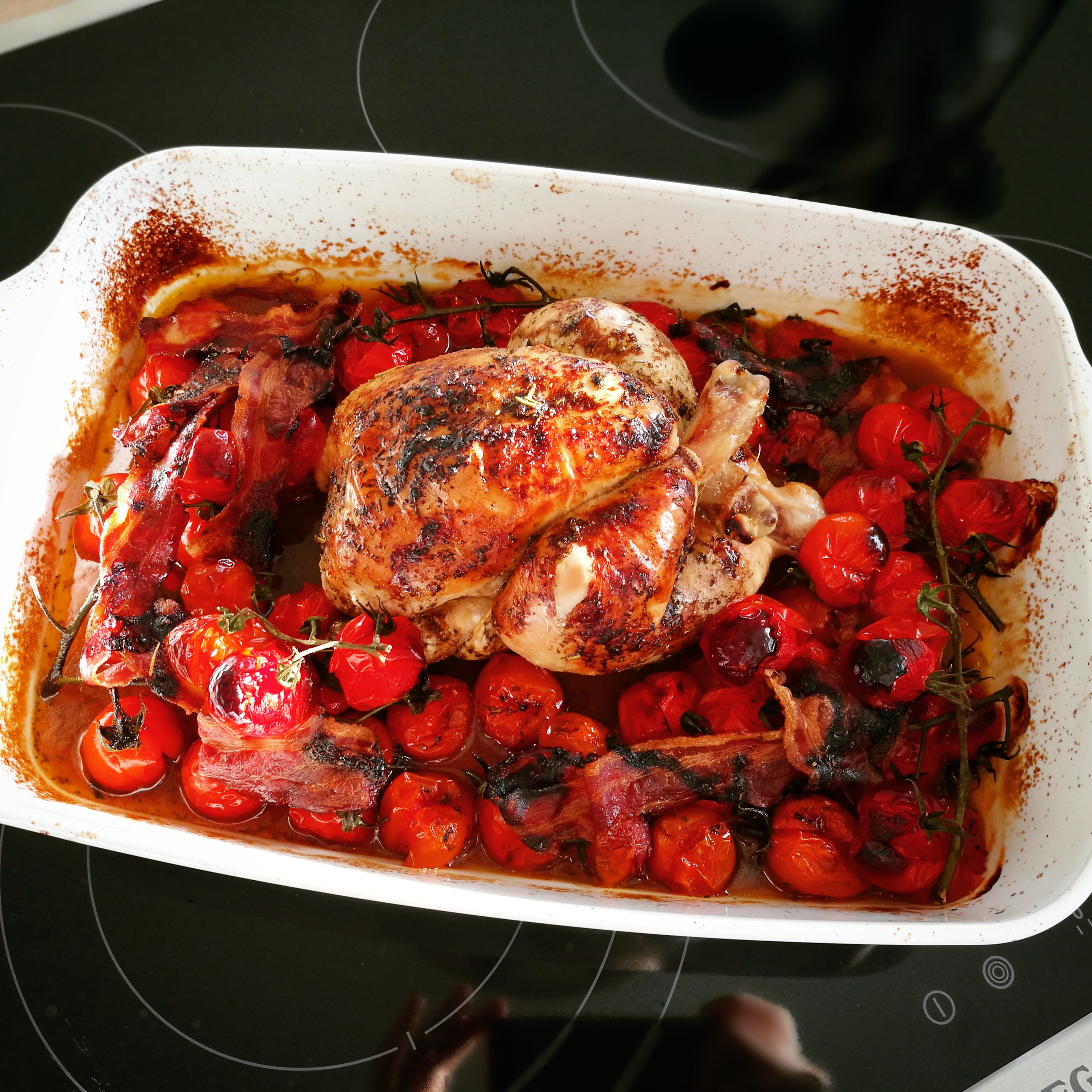 Déposer le coquelet dans le plat de cuisson. Répartissez les tomates cerises autour. Mettre 2 tranches de lard fumé dans la cavité du coquelet et répartir les autres dans le plat. Ajouter les olives et terminer en arrosant avec la sauce préparée au préalable (coquelet inclus).