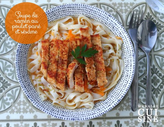 Répartir les nouilles dans les assiettes creuses (ou bols) et verser le bouillon brûlant par dessus. Ajouter le poulet pané et l’oignon ciselé.