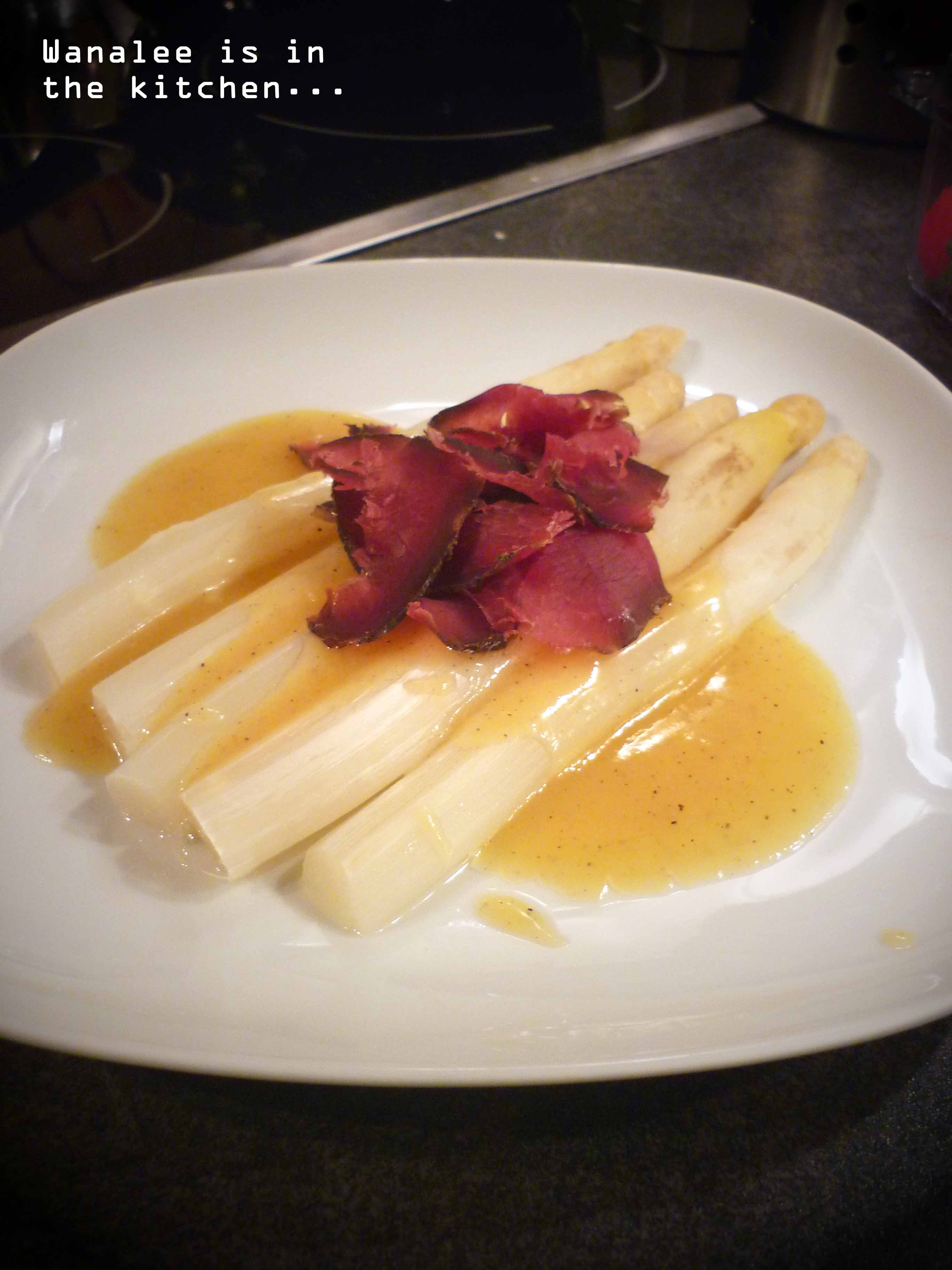 Dresser les asperges sur des assiettes chaudes. Napper de sauce et parsemer de viande séchée coupée en lamelles.