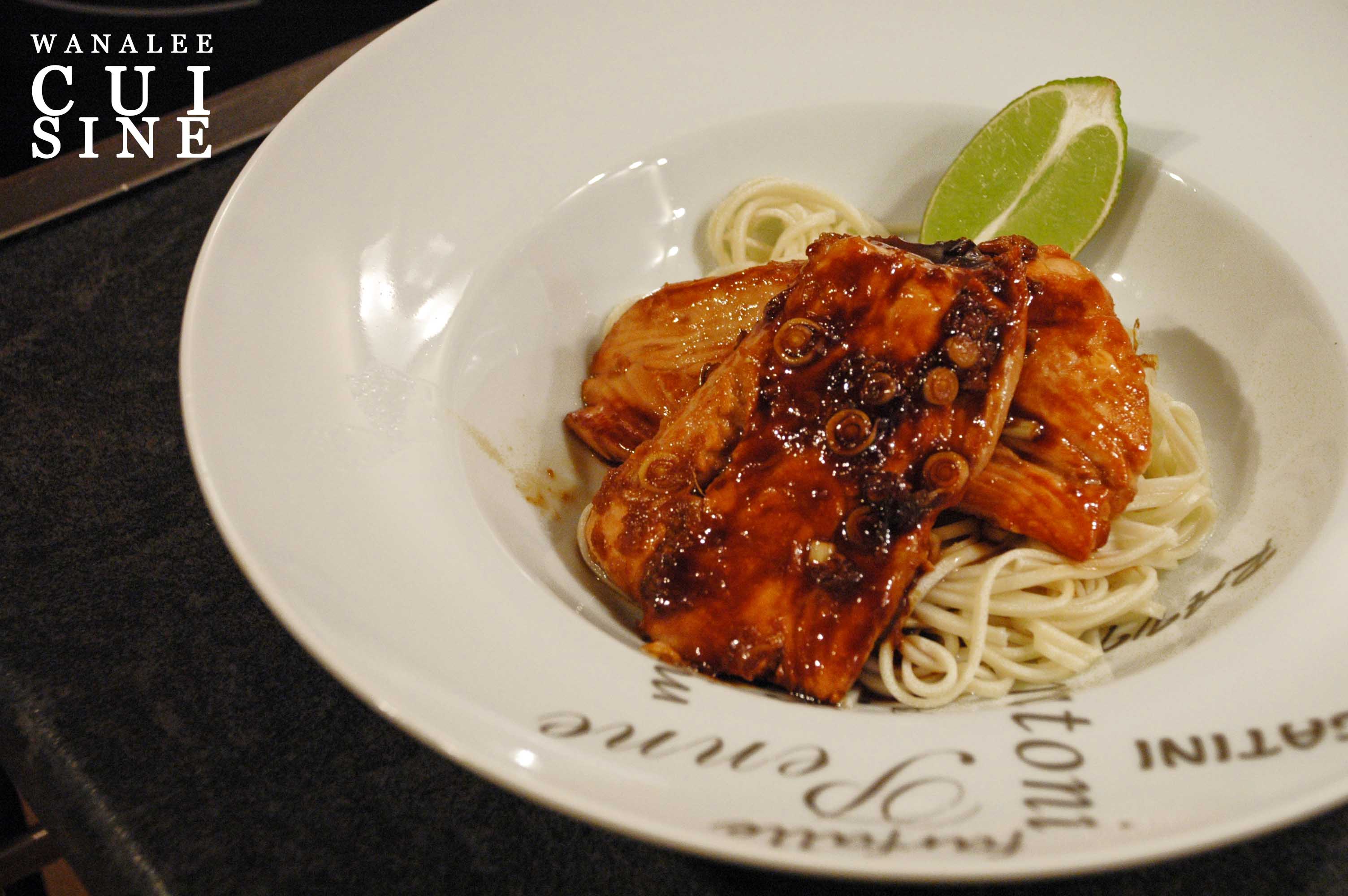 Enfourner pour 20 minutes. Servir avec des nouilles asiatiques.