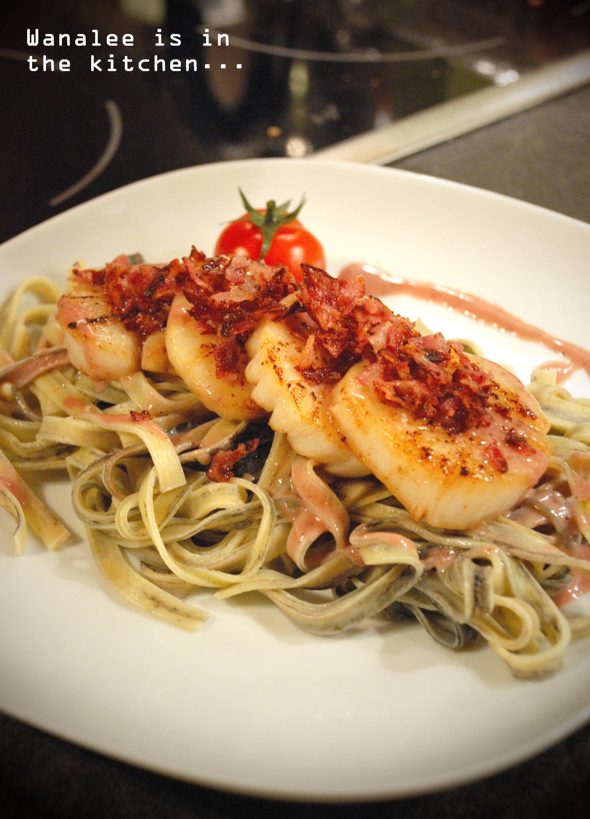 Servir immédiatement en déposant les st-jacques sur un nid de tagliatelles, puis saupoudrer de crumble de bacon. Terminer par un filet de sauce au vinaigre de framboise.